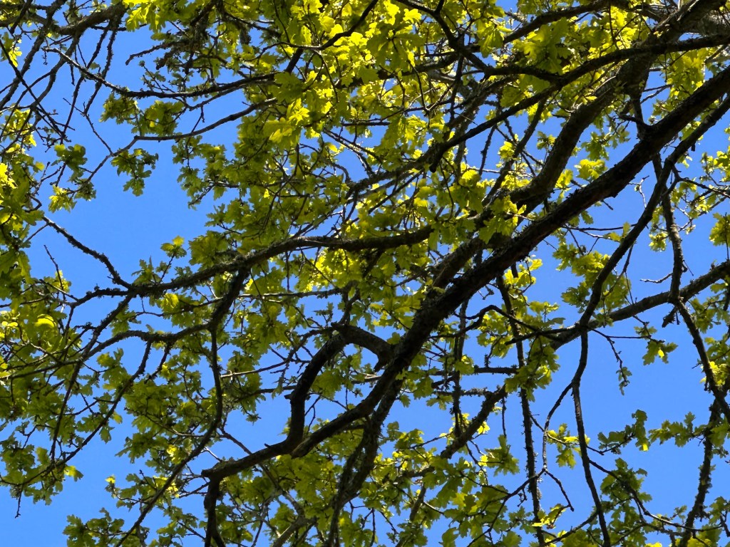 It’s late April, a week from Beltane, the peak of springtime. Entering the glade, I tip my face skyward and feel the warmth of the sun’s rays through the treetop canopy of the first leaf-burst on the old oak trees. Vibrant with new life in lime green, their brightness in stark contrast to the black wood limbs they spring from. Youthful energy emanates from their rounded lobed edges, fluttering gently in the breeze, waving hello to the sun that fills them with warm lifeforce. Oaks are home to more biodiversity than any other native tree, one of the reasons my ears are full of a state symphony of birdsong! There are so many different songs playing at once I find myself transfixed to the spot, trying hard to single out different species. Twittering, yohooing, drum-beating, trilling, wolf-whistling, where-oh-where-are-you’ing, and a soprano escalating solo. Honking! I gasp as two geese fly overhead. I wasn’t expecting the water brigade couple’s baritone!