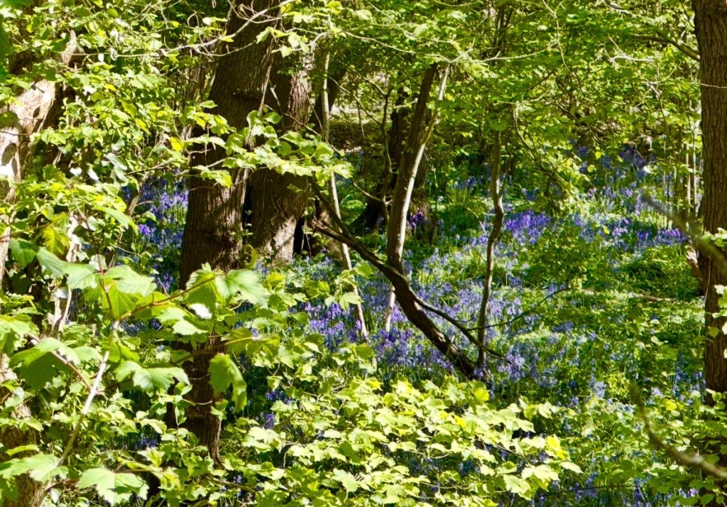 We walk together, making very slow progress as there’s so many great smells to snuffle and sniff. Denser into the woods a valley opens up showcasing a woodland floor of bluebell flowers, their little heads dipped like lantern lights on a pole. It’s a special time, bluebells are like shooting stars, they only light up the world for human eyes for just a fleeting moment. Best to take time and stop to really appreciate their beauty. They make such a beautiful sight my eyes spill over with tears. The fairies are near; these flowers belong to their realm. It’s dangerous for humans to walk through bluebells or pick them, which is fair I feel, the fairies are protecting them. I wonder if I stay very quiet and listen very hard if I can hear the fairies ring the bluebells to summon their kinfolk. Who wouldn’t want to party in springtime under an awning of bluebells!